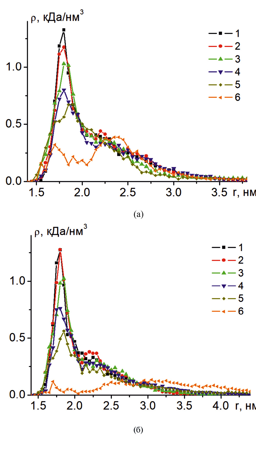 Рис. 3. Радиальные зависимости средней плотности атомов комплекса полипептидов P3 и N3 (а), а также блок-сополимера NP1 (б) на поверхности заряженной сферической металлической наночастицы с различной поверхностной плотностью заряда: 0 (1), σ+0.05 (2), σ+0.1 (3), σ–0.1 (4), σ+0.2 (5) и σ–0.2 (6).