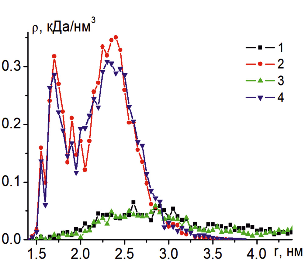 В результате молекулярно-динамического моделирования двух разноименно заряженных полиэлектролитов происходила адсорбция макромолекул на поверхности сферической золотой наночастицы и ее обволакивание (рис. 1а). Противоположно заряженные макроцепи притягивались друг к другу, образуя в целом нейтральный макромолекулярный комплекс, который удерживался на поверхности наночастицы за счет Ван-дер-Ваальсова притяжения. На рис. 1в (кривые 2 и 3) изображены радиальные распределения средней плотности атомов полиэлектролитов, находящихся в комплексе и адсорбированных на поверхности нейтральной сферической наночастицы. Данные радиальные распределения средней плотности атомов полипептидов имеют характерный пик у поверхности адсорбента, схожий для случая адсорбции нейтральных макроцепей [12, 13].