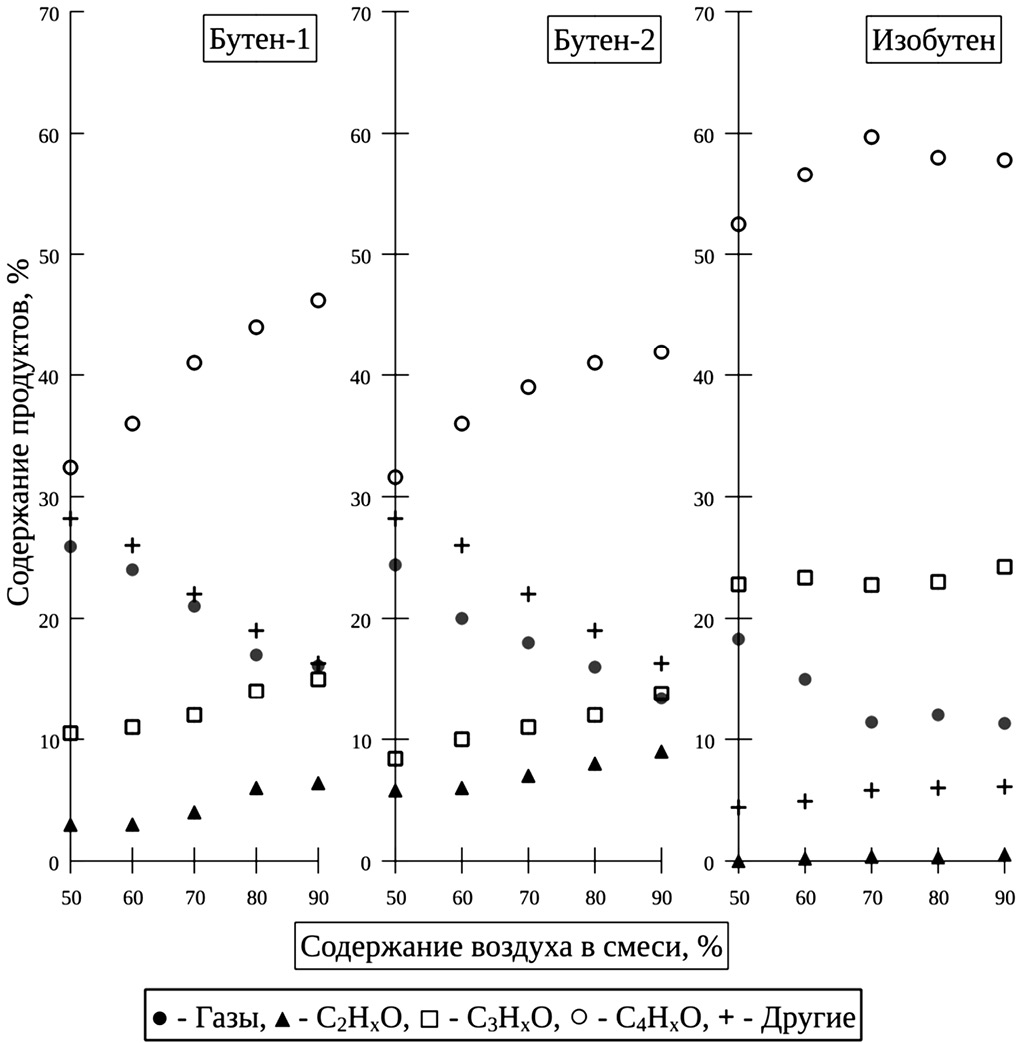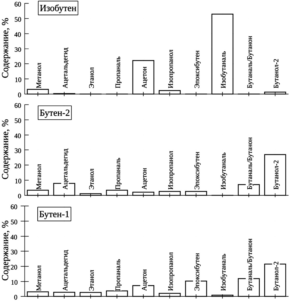 На образование продуктов реакции значительное влияние оказывает молекулярная масса и строение молекулы исходного олефина. В ряду этилен–пропилен–бутилен повышается содержание кислородсодержащих веществ с 28.1, 74.3 и 66.7 мас. % соответственно. При окислении изобутена преимущественно образуются изомасляный альдегид и ацетон с содержанием 53 и 21 мас. % соответственно. В случае окисления нормальных бутенов основным продуктом является бутанол-2 (до 26 мас.%), при этом положение двойной связи в исходном олефине не оказывает существенное влияние на состав продуктов окисления.