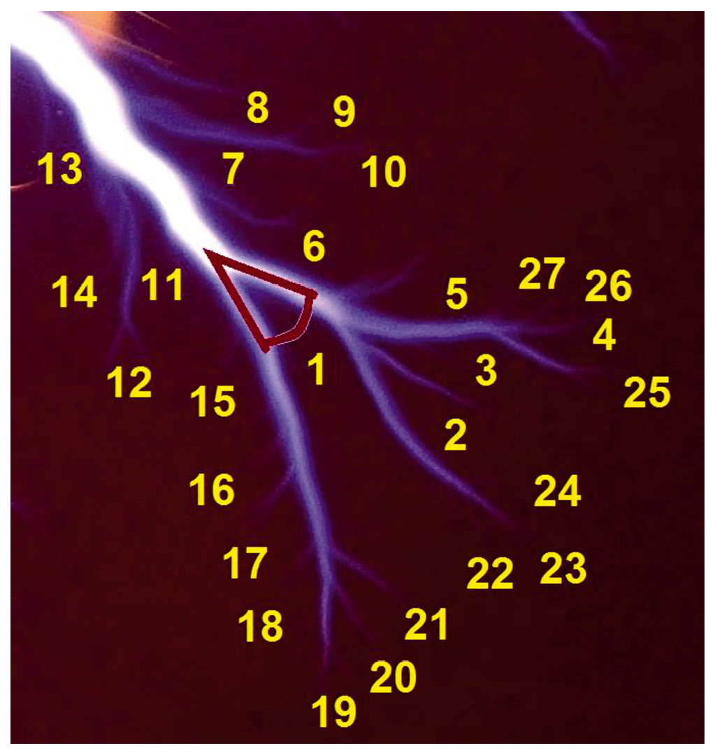 Одна из важных задач исследований разветвленных стримерных разрядов заключается в изучении морфологии разветвления каналов, включающем измерение или вычисление геометрических параметров канальной структуры: статистики длины ветвей [8-10] и углов разветвления [10-13], фрактальных размерностей разветвленной системы [14, 15].