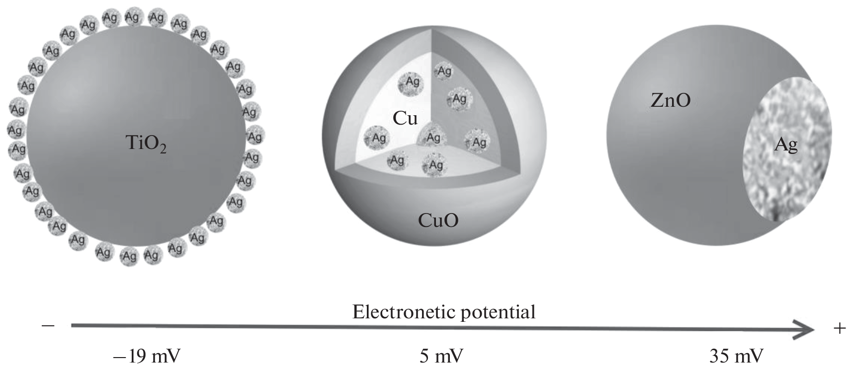 The chemical compositions, structures, and electrokinetic potentials have been studied for silvercontaining Janus-type ZnO/Ag nanoparticles, heterophase Cu/Ag nanoparticles with a uniform distribution of the components over a particle, and silver-decorated TiO2 nanoparticles. The nanoparticles have been obtained by the simultaneous electric explosion of two wires. The influence of nanoparticle surface structure on the isoelectric point position and electrokinetic potential values has been analyzed. The effect of silver localization on the electrokinetic characteristics of nanoparticles has been investigated. These characteristics have been compared with those of mechanical mixtures having the same mass ratios of the components.