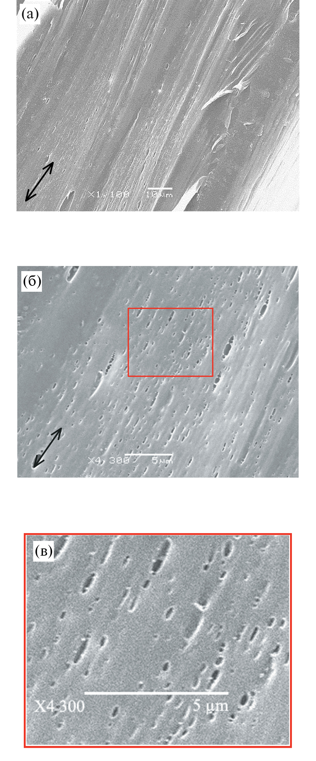 Рис. 3. СЭМ-микрофотографии ПЛ после структурной модификации с импрегнацией CuSO4. Микрофотография (в) является увеличенным изображением прямоугольной области, обозначенной на микрофотографии (б). Стрелками указано направление растяжения.