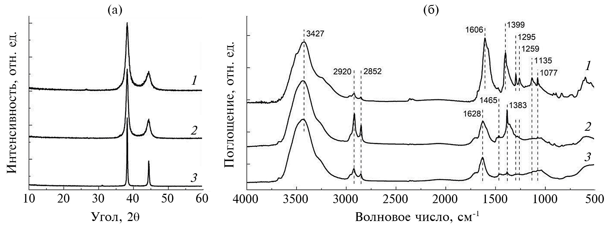 Рис. 4. РФА (а) и ИК-Фурье спектры (б) высушенных образцов исходных гидрозолей серебра (кривая 1), органозолей серебра (кривая 2) и не переходящего в фазу о-ксилола осадка (кривая 3).