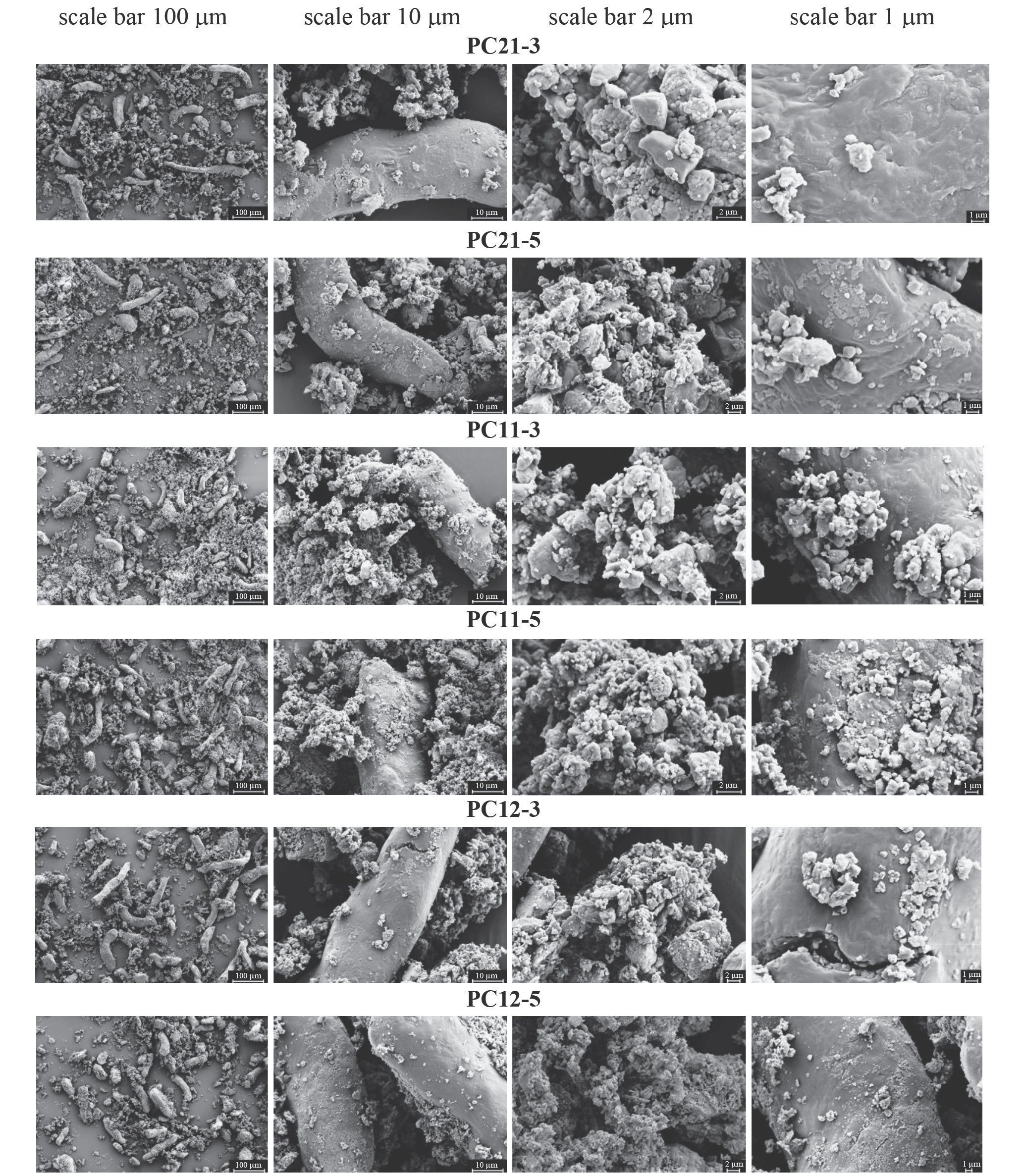 Изменения морфологии поверхности частиц после применения механохимической активации ударно-истирающего типа видны также на СЭМ-изображениях композитов ПВС/КМЦ при четырех увеличениях (рис. 2). Анализ этих изображений показал, что агрегаты частиц ПВС размещаются в дефектных областях фибриллярных волокон КМЦ (РС21-3) и внедряются в дефектные слои волокон КМЦ (РС21-5). При эквимассовом соотношении исходных полимеров в составе композитов также имеется гетерогенная система с агломератами из агрегатов частиц ПВС на волокнах и на их расшелушенной поверхности (РС11-3; РС11-5). В случае преобладания КМЦ в составах композитов регистрируется наличие трещин на ее волокнах и агрегатов частиц ПВС (РС12–3), а также агрегаты с агломератами агрегатов частиц на волокнах КМЦ (РС12–5). На всех СЭМ-изображениях образцов ПВС/КМЦ наблюдается неоднородная микроструктура с внедрением агрегатов ПВС в дефектные фибриллярные волокна КМЦ.