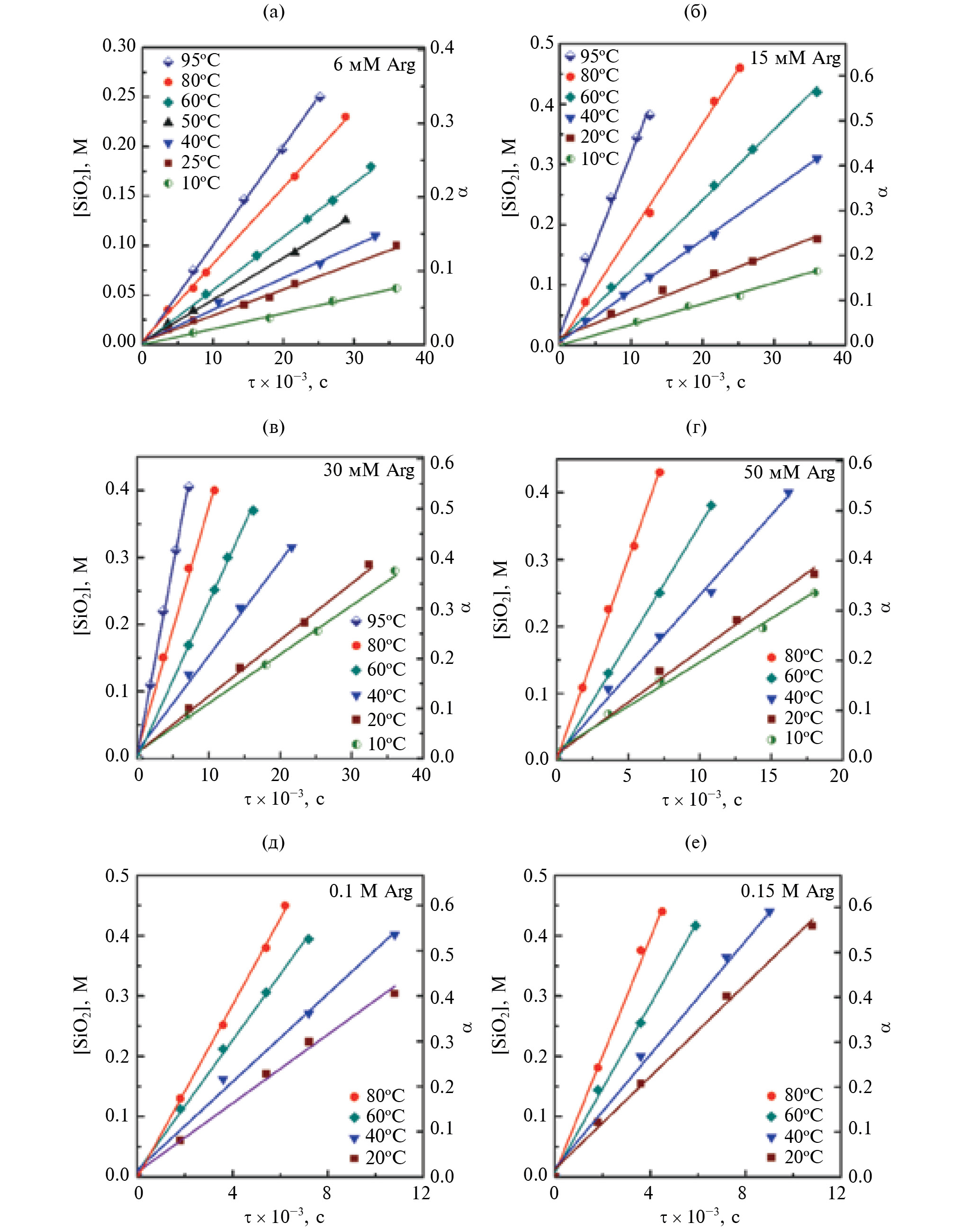 Для концентраций L-аргинина в реакционной смеси 6, 15, 30, 50 мМ изменение температуры от 20 до 80°C приводит к увеличению скорости процесса образования SiO2 в ~4 раза. При более высоких концентрациях катализатора (100 и 150 мМ) влияние температуры на скорость процесса несколько снижается, и изменение скорости процесса в том же диапазоне температур составило 3 и 2.5 раза соответственно (табл. 1).