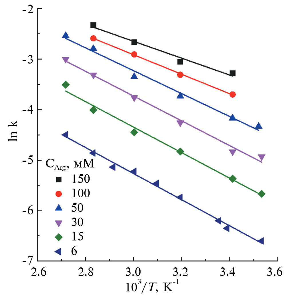 В координатах ln k – 1/Т зависимости констант скорости процесса от температуры хорошо описываются прямыми линиями (рис. 4), что позволяет рассчитать энергию активации процесса при каждом значении концентрации L-аргинина, используя уравнение Аррениуса: