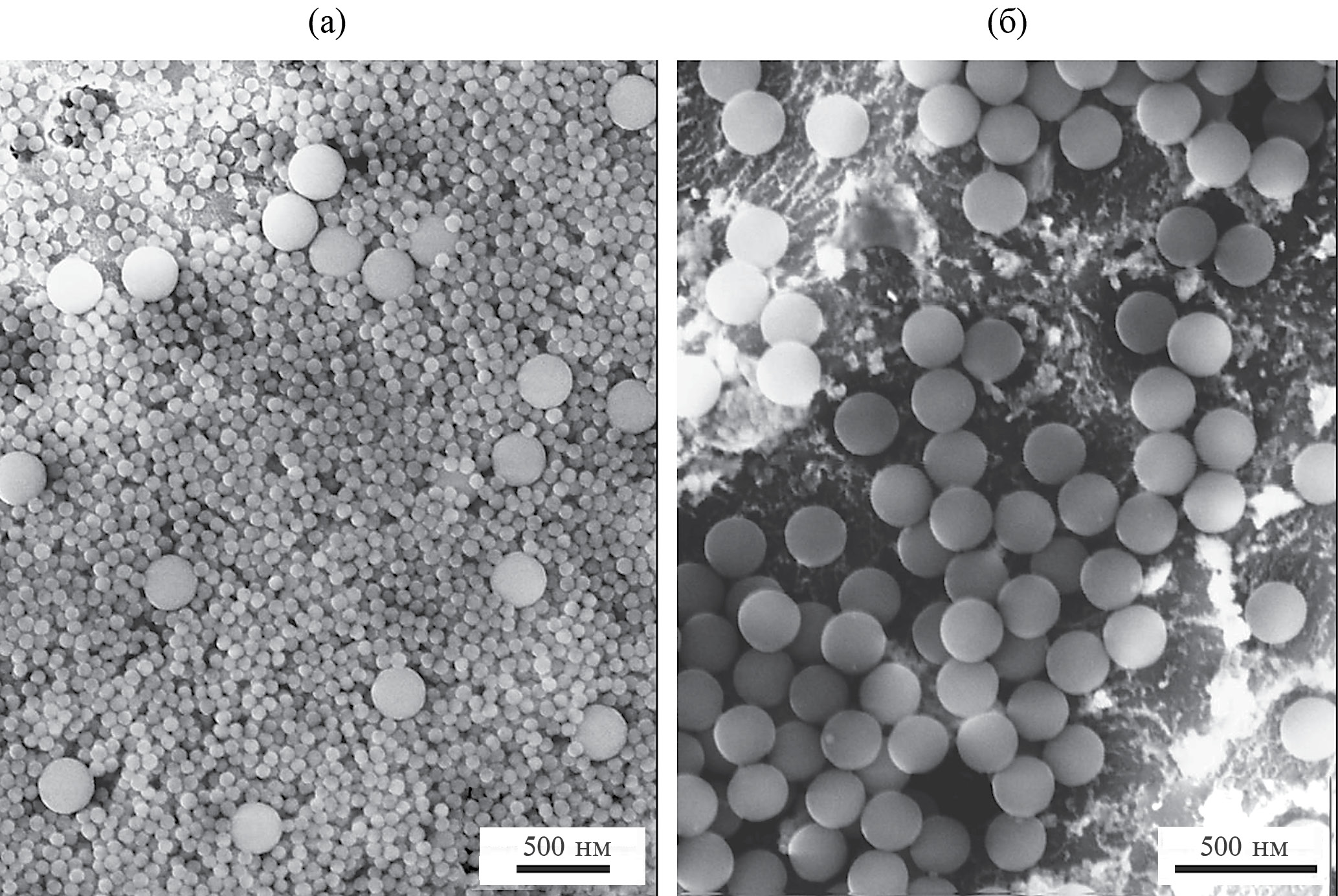 Рис. 7. СЭМ-изображения частиц SiO2, полученных доращиванием затравок: (а) бимодальное распределение частиц по размерам; (б) монодисперсные частицы.