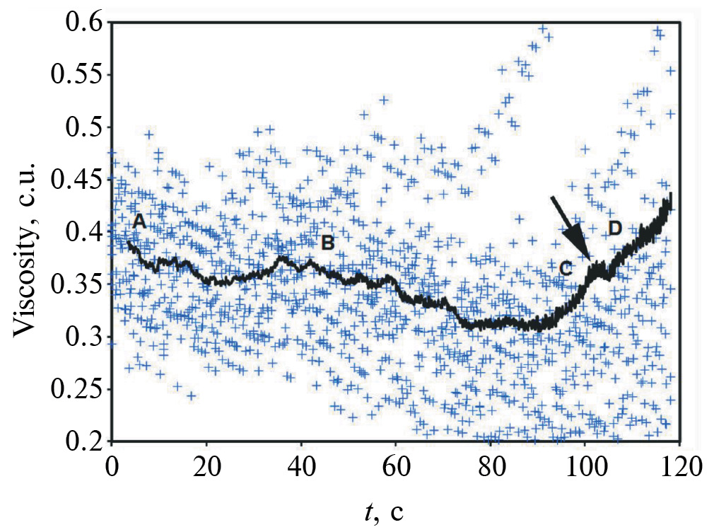 Вычисленные средние значения вязкости молока на определенных интервалах времени ферментативной стадии коагуляции использовали для графического отображения ее изменения во времени (рис. 1), где А – начало процесса, В – середина стадии, С – момент перед гель-точкой, D – момент после гель-точки.
