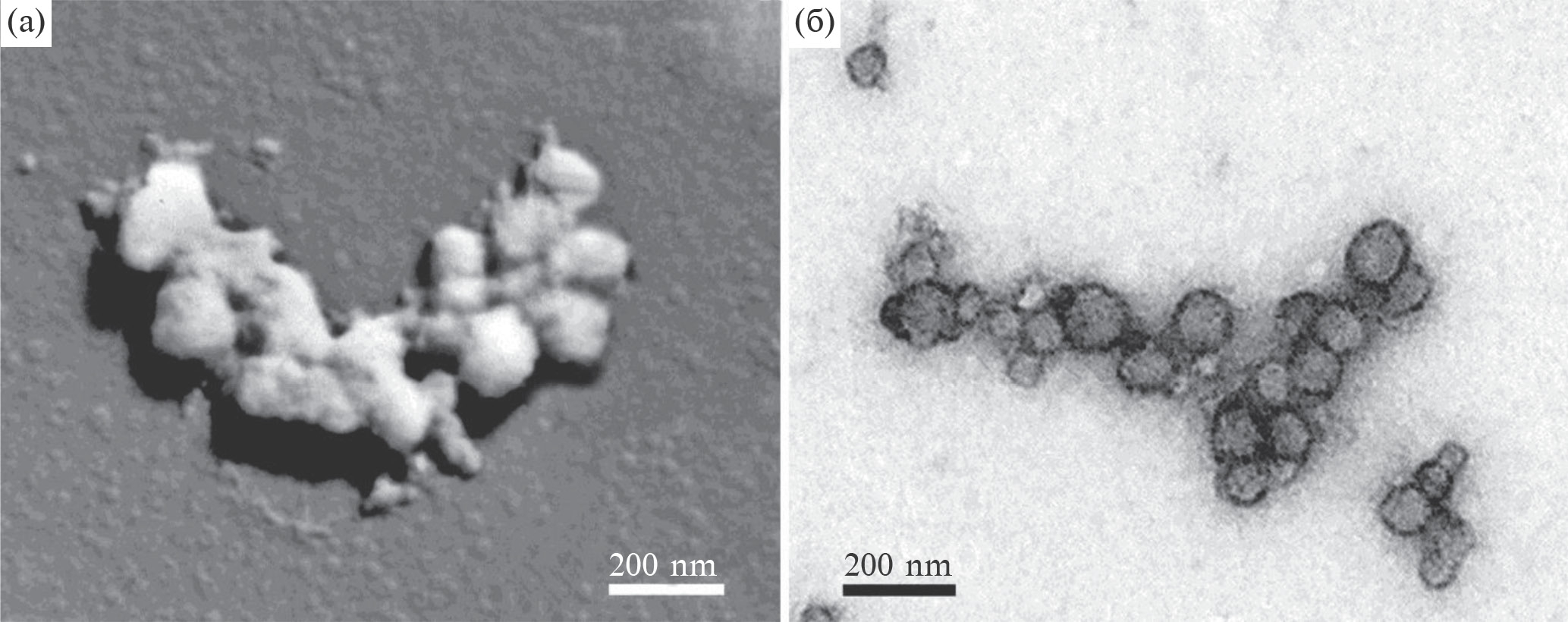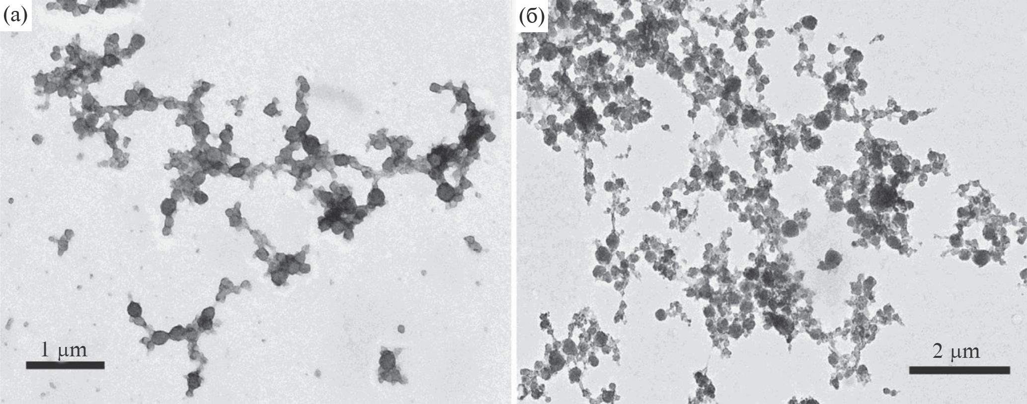 Рис. 5. Образование кластеров мицелл казеина к середине ферментативной стадии гелеобразования: (a) метод оттенения; (б) метод контрастирования.