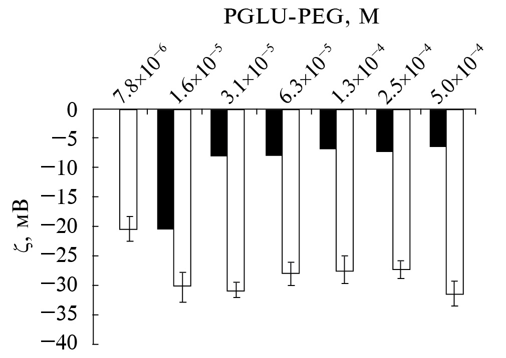 Блок-сополимеры PGLU10–PEG и PGLU100–PEG характеризуются значениями ζ-потенциала в –15 ± 1 и –40 ± 2 мВ соответственно. Отрицательные значения ζ-потенциала обусловлены наличием ионизованных карбоксильных групп в молекулах PGLU–PEG.