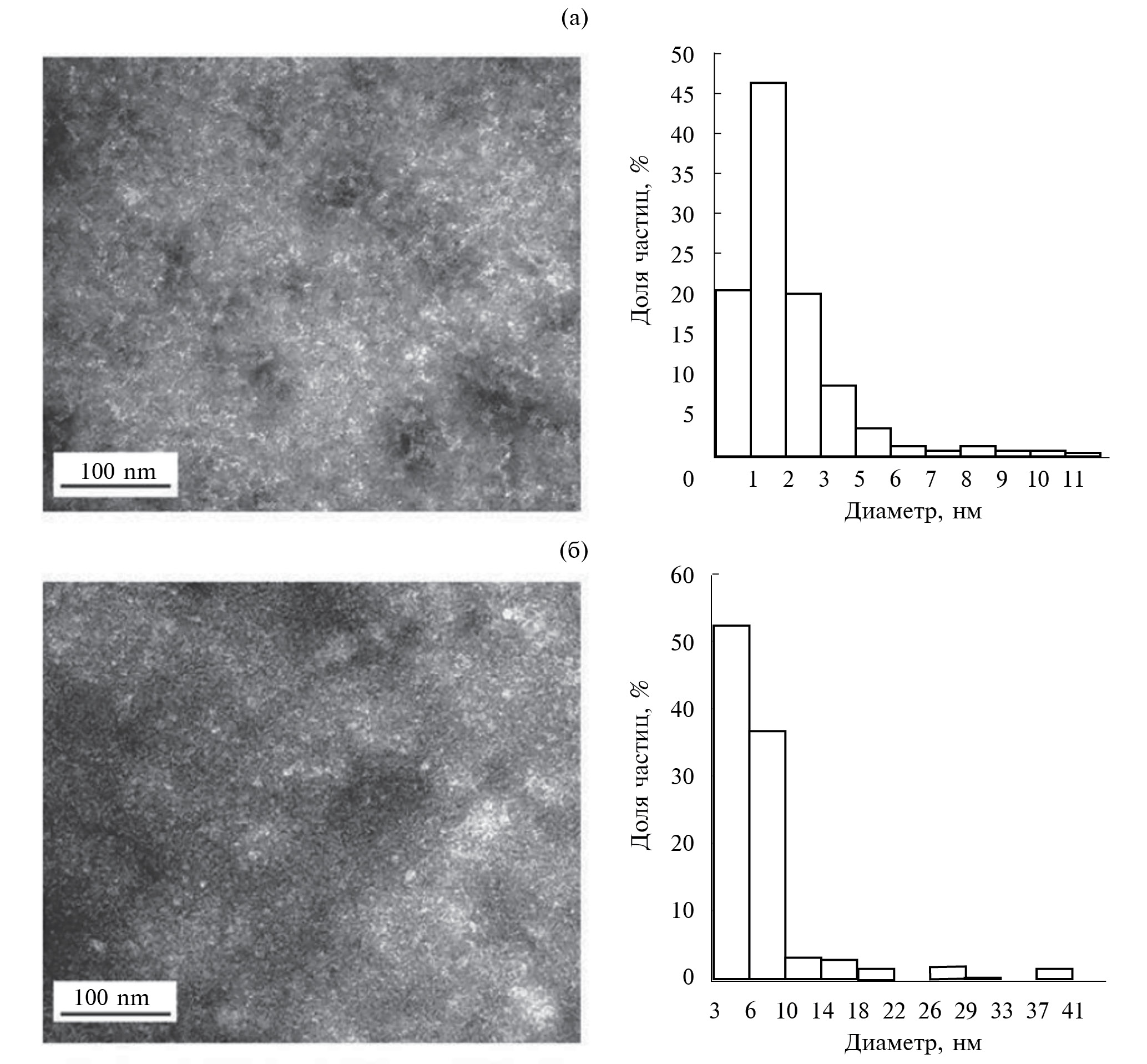 Рис. 5. ПЭМ-изображения и распределения частиц по размерам для блок-сополимера PGLU10–PEG (а) и лизоцима с блок-сополимером PGLU10–PEG, Z 18 : 1 (б).