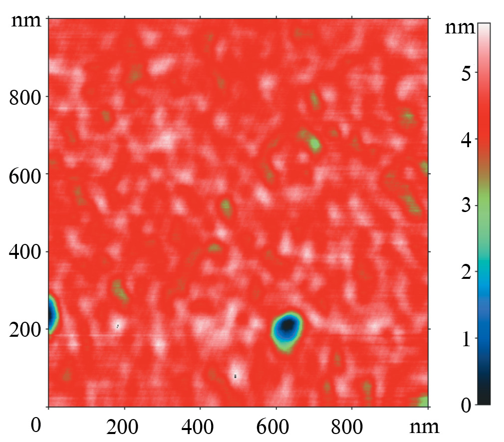 В результате анализа поверхности полиимидной пленки без добавления красителя с помощью ССМ выявлено, что высота рельефа составляет 0.5–1.5 нм с содержанием микропор 69.9% (рис. 1). В то же время анализ морфологии пленок ПМО показал, что происходит небольшое изменение количества пор и их размера (табл. 1) с преобладанием микропор, увеличивается шероховатость поверхности (табл. 2). При этом пленки ПМО-Е127 (рис. 2) и ПМО-Е132 (рис. 3) имеют незначительное количество дефектов поверхности, а высота рельефа составляет 3–4 нм. Таким образом, после удаления молекулы темплата на поверхности пленки остаются полости (молекулярные отпечатки), которые комплементарны по форме и размеру, а также по расположению функциональных групп в молекуле красителя.