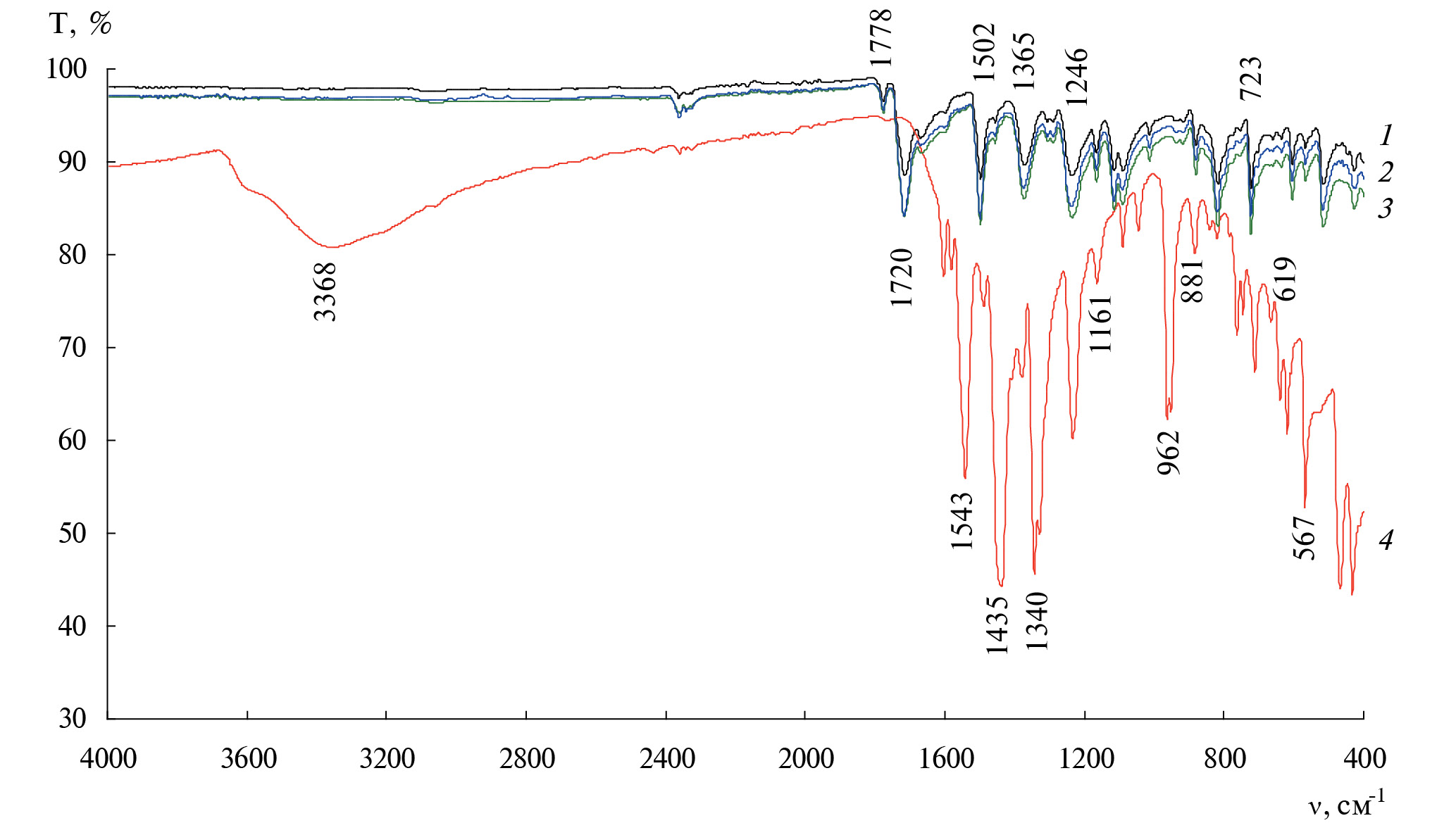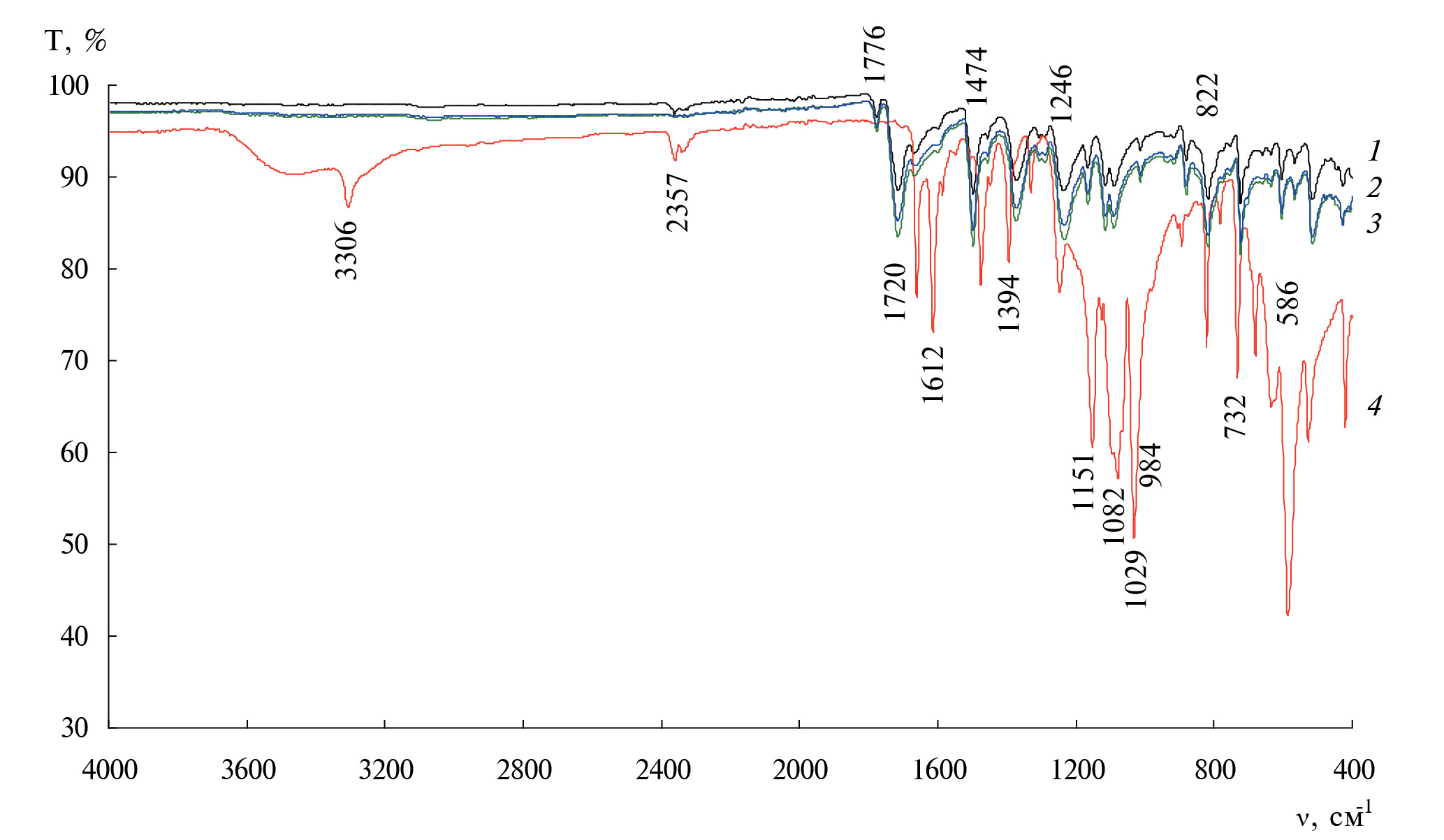 Рис. 4. ИК-спектр красителя эритрозина (Е127) и полимерных пленок на основе полиимида: 1 – чистый полимер; 2 – полимер после удаления красителя; 3 – полимер с красителем; 4 – краситель.