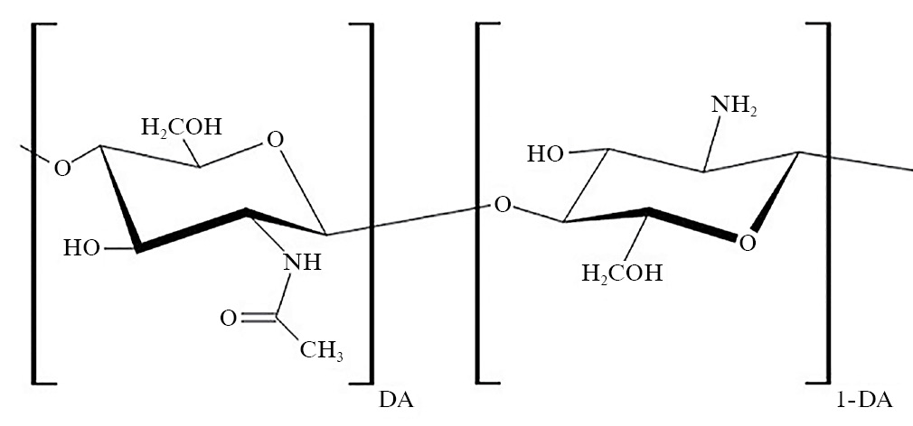 Хитозан является линейным полисахаридом, имеющим в своем строении два структурных звена: D-глюкозамин и N-ацетил-D-глюкозамин, которые соединены β (1→4) гликозидной связью. Получение хитозана основано на деацетилировании хитина (химический аналог хитозана) в щелочной или кислой среде. Молекула ХЗ содержит одну –NH2 группу и две –OH группы на каждый гликозидный остаток (рис. 1).