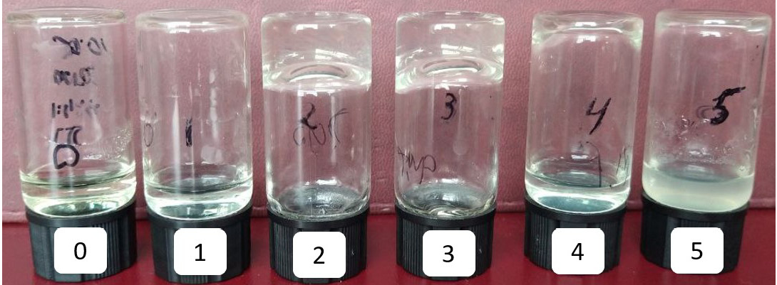 На рис. 2 показаны фотографии ЦСР-ХЗ-CuSO4 гидрогелей с различным содержанием ХЗ и электролита через 5 дней после синтеза, из которых видно, что гель-структуру, не разрушающуюся при переворачивании флакона, в этот момент имеют образцы 2 и 3. В образце 5 наблюдаются признаки коагуляции (мутность). С помощью такой визуальной оценки установлено, что существует определенный, довольно узкий, концентрационный диапазон ХЗ и электролита, в котором происходит образование устойчивых во времени гидрогелей.