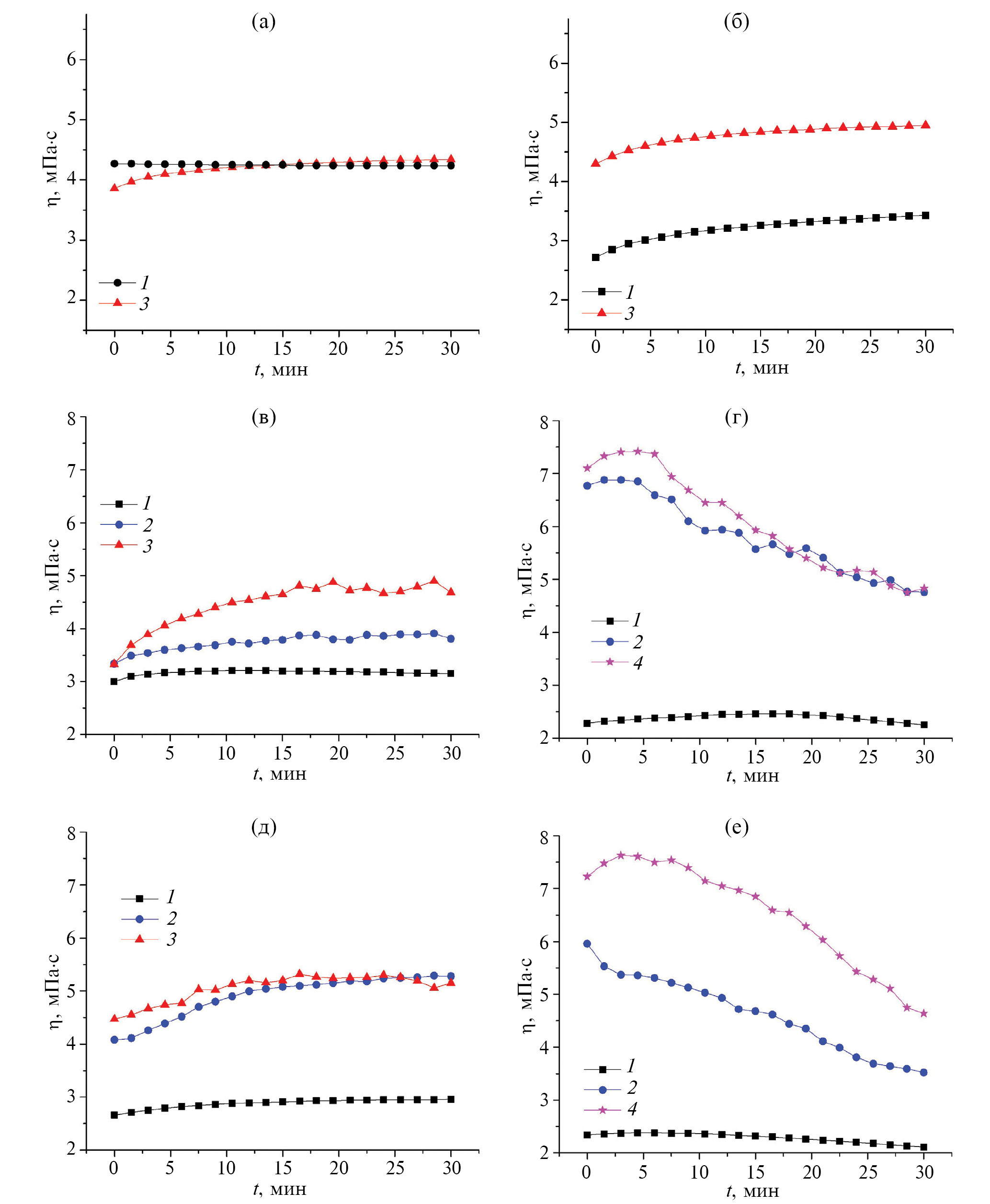 Рис. 3. Зависимость динамической вязкости от времени хранения для гидрогелей а, б – ЦСР-ХЗ [25]; в, г – ЦСР-ХЗ-CuSO4; д, е – ЦСР-CuSO4. Концентрация ХЗ и CuSO4 в образцах: а, в, д – Схз= 0.0100 мг/мл, CCuSO4=0,4 мМ; б, г, е – Схз=0.0125 мг/мл, CCuSO4=0,5 мМ. 1 – через 30 мин после синтеза, 2 – через 3 дня после синтеза, 3 – через 6 дней после синтеза, 4 – через 10 дней после синтеза.