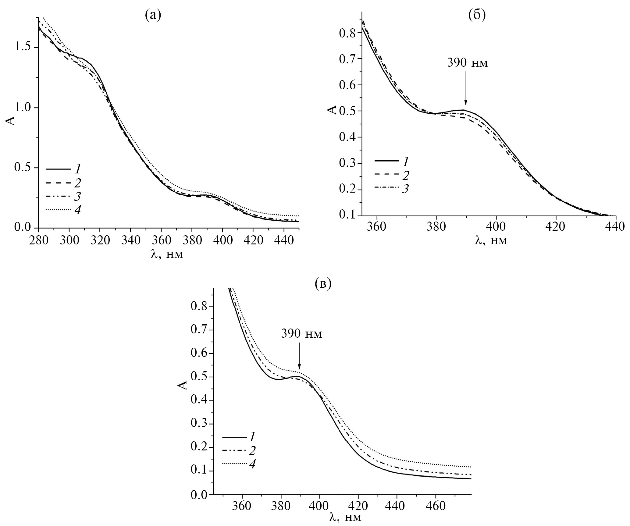 Рис. 4. Электронные спектры образцов в зависимости: от состава (а) – ЦСР (1), ЦСР-ХЗ (2), ЦСР-ХЗ-CuSO4 (3), ЦСР-CuSO4 (4) Схз=0.0100 мг/мл, CCuSO4=0,4 мМ, толщина кюветы – 1 мм, через 2 дня после синтеза; от концентрации ХЗ (б) – (0 (1), 0.0100 (2), 0.0150 (3) мг/мл) (3), толщина кюветы – 2 мм, через 7 дней после синтеза; от состава (в) – ЦСР (1), ЦСР-ХЗ-CuSO4 (2), ЦСР-CuSO4 (4), Схз = 0.0150 мг/мл, CCuSO4 = 0,6 мМ; толщина кюветы – 2 мм, через 7 дней после синтеза.
