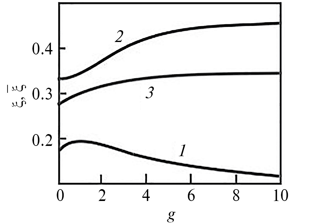 Рис. 6. Предельные (ω → ∞) значения ξ(β) и как функции от безразмерного модуля жесткости композита g. Кривые 1 и 2 – значения ξ(β) при β = 0 и π/2 соответственно; кривая 3 – усредненное значение .