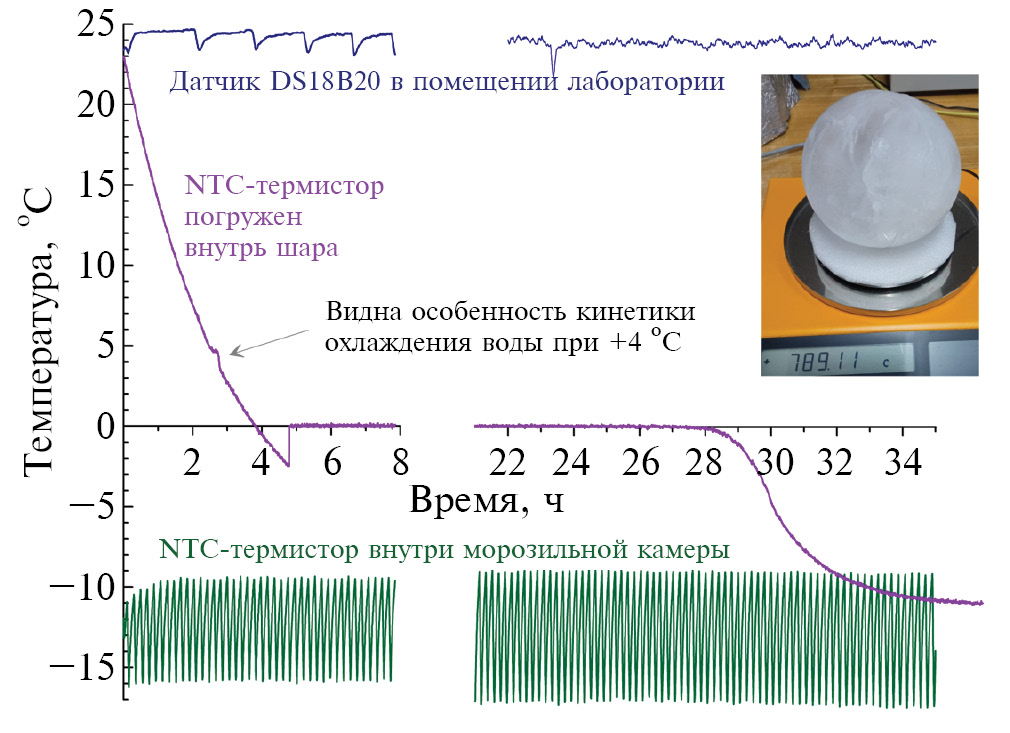 Бидистиллированная вода (проводимость 2–4 мкСм/см) замораживалась в полых пластиковых шарах в морозильной камере холодильника при T = –15… –11°C. В результате чего получались ледяные шары объемом 0.5, 0.8 и 1.6 литра. Внутрь шаров вмораживался термодатчик DS18B20 для непрерывного измерения температуры. Калибровка этого и всех остальных термодатчиков, использовавшихся в работе, была проведена с помощью термостата LAUDA ECO GOLD.