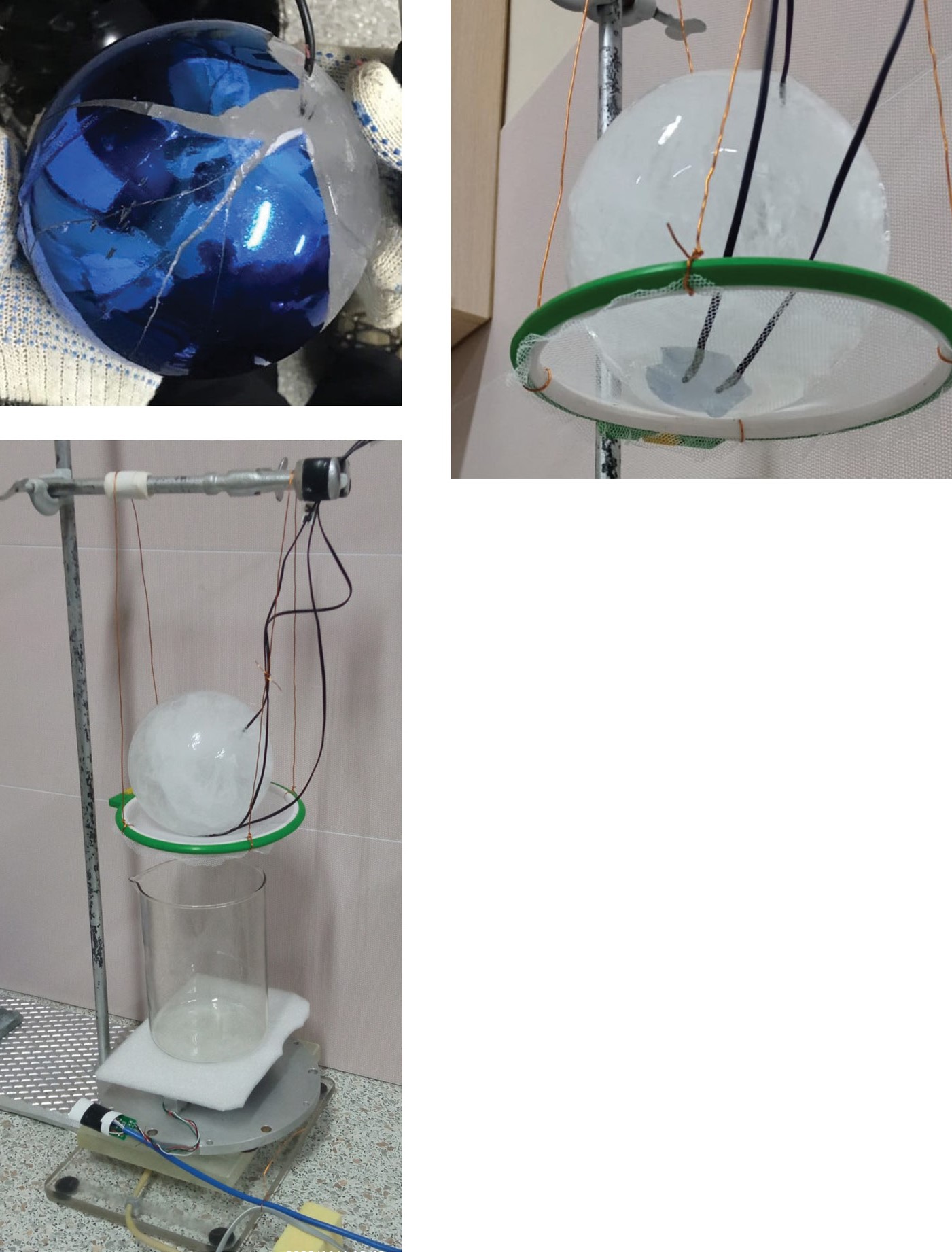 Рис. 2. Этапы эксперимента: замораживание воды в пластиковой форме с термодатчиком в центре в морозильной камере, отделение пластиковой формы, взвешивание ледяного шара, его фиксация над стаканом для сбора талой воды, непрерывное измерение массы талой воды и температуры как внутри, так и снаружи ледяного шара.