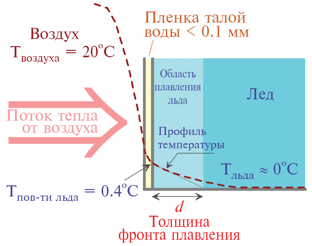 Эта пленка является своего рода “шубой”, отделяющей воздух от непосредственного контакта с поверхностью льда. Основной перепад температур (от комнатной почти до 0°C) реализуется снаружи этой пленки со стороны воздуха. Схематично распределение температуры на границах воздух–вода–лед показано на рис. 3 (здесь следует учесть, что теплопроводность воздуха в 24 раза меньше теплопроводности воды, а теплопроводность льда в четыре раза большее, чем у воды). Поток тепла от воздуха проходит без существенных потерь через пленку талой воды и далее проникает внутрь кристаллической решетки льда, где и расходуется на его плавление. Величину этого потока (как функцию времени) мы определяем посредством измерения кинетики накопления талой воды.