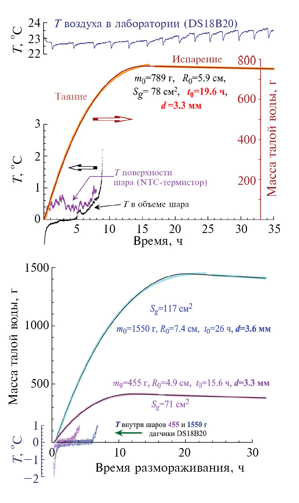 Эксперименты по плавлению ледяных шаров различного размера проводились при комнатной температуре. При фитировании данных учитывалось, что подвод тепла к шару происходит через его поверхность, которая постепенно уменьшается. Также учитывалась поправка, связанная с испарением талой воды из стакана, в котором она накапливалась. В результате были определены времена таяния шаров t0, которые, в свою очередь, были пересчитаны на толщину фронта плавления льда. Во всех измерениях эта величина оказалась примерно одинаковой, d ≈ 3.2…3.6 мм, несмотря на то, что исследованные шары имели разные массы и размеры. Именно в приповерхностном слое льда такой толщины единовременно происходит поглощение скрытой теплоты плавления или, другими словами, идет процесс таяния льда.