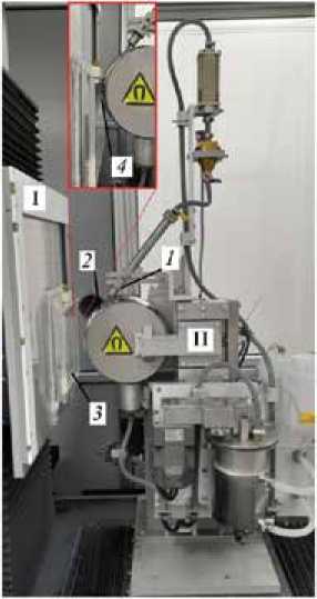 Рис. 3. Фотография модуля магнитореологического полирования: блок рабочего инструмента (I); блок циркуляции магнитореологической суспензии (II): сопло подачи МРС (1); немагнитная поверхность вращающегося инструмента (2); поверхность обрабатываемой детали НОЭ (3); локальная рабочая области обработки – пятно контакта (4).