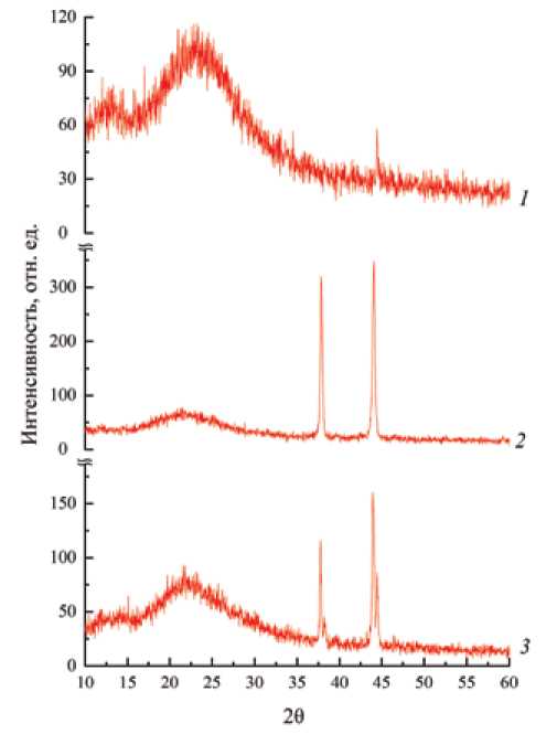 Рис. 5. Дифрактограммы нанопорошка SiO2, полученного золь-гель методом (1); пирогенного “Аэросила” марки А-300 (2); аморфного кремнезема марки “Полисорб” (3).