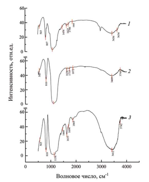 Из рис. 6 видно, что в ИК-спектрах каждого образца имеются интенсивные полосы поглощения при 807, 810 см–1 (Si–O–Si) и широкая полоса в области 1100–1200 см–1, характеризующая колебания группы (Si-O-Si) [26], которые являются характерными пиками SiO2. Как видно из рис. 6, в области 3410–3420 см–1 во всех трех спектрах наблюдается широкая интенсивная полоса поглощения, характеризующая колебания группы Si–OH. Причем следует заметить, что интенсивность сигнала этого колебания наибольшая у аморфного кремнезема марки “Полисорб” (рис. 6, 3), что свидетельствует о наибольшей степени гидроксилирования этого образца кремнезема [27].