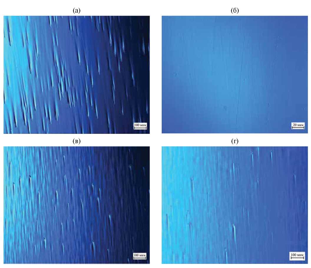 Рис. 7. Поверхность НОЭ после магнитореологического полирования: 10х, без наноабразива SiO2 (а); 50х, в присутствии наноабразива SiO2 (б); 10х, в присутствии “Аэросила” марки А-300 (в); 10х, в присутствии кремнезема марки “Полисорб” (г).