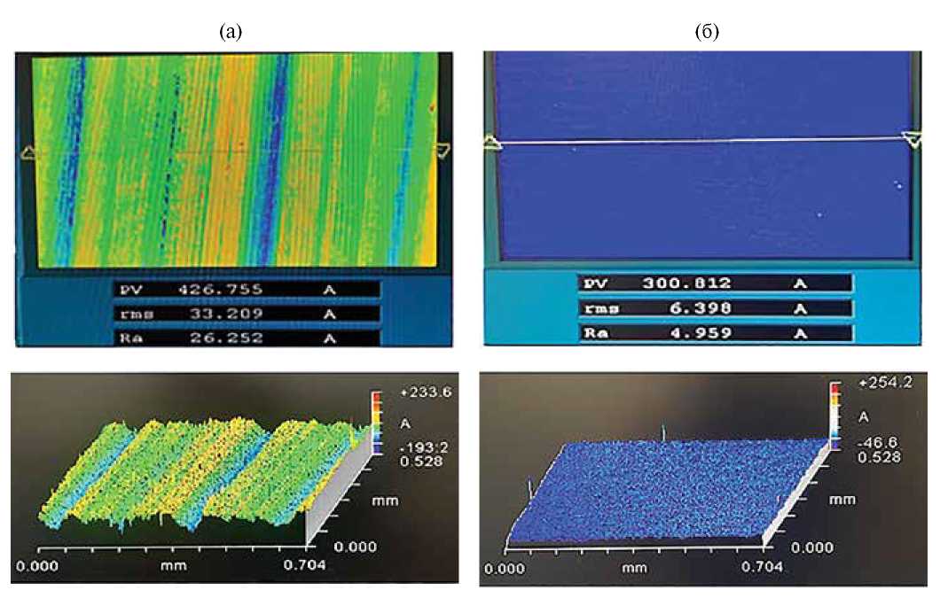 Рис. 8. Оценка шероховатости поверхности: до МР-обработки, rms = 3.32 нм (а); после МР-обработки, rms = 0.64 нм (б).