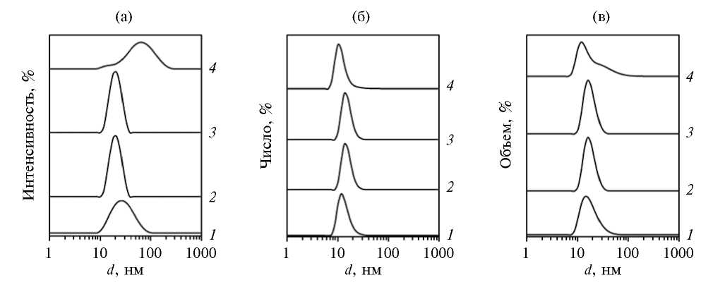 Рис. 5. Распределение по размерам частиц Pluronic P123 при варьировании соотношения n(Quer) : n(P123): 1 – 0; 2 – 0.024; 3 – 0.072; 4 – 0.144: а) по интенсивности рассеяния; б) по числу частиц; в) по объему. T = 20°С, n(EtOH) : n(P123) = 160 : 1.
