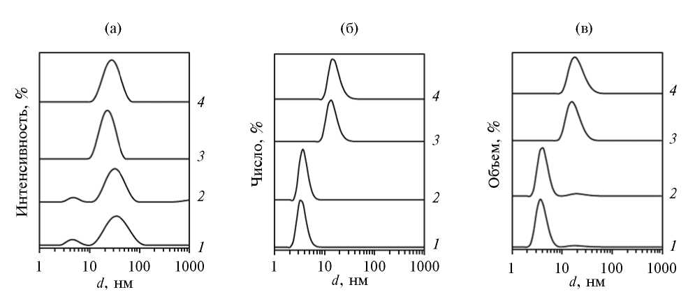 Распределения частиц по размерам в единицах интенсивности получены из анализа автокорреляционных функций с использованием алгоритма General purpose программного обеспечения анализатора. Распределение по размерам в единицах объема и числа частиц проводилось согласно теории Ми. Средний размер частиц в системе определяли методом кумулянтов. Гидродинамический диаметр частиц рассчитывали по уравнению Стокса–Эйнштейна: