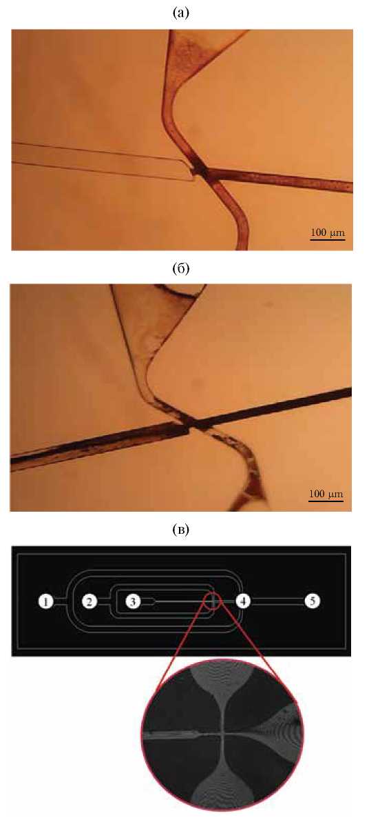 Было установлено, что МНЧ в ходе проведения химической реакции оседают на стенках канала, создавая агрегаты, что в узком проходе апертуры приводит к закупориванию канала и сильно затрудняет протекание потоков (рис. 2а). Увеличивая давление, преодолеть закупоривание канала возможно, но в конечном итоге вся его поверхность загрязняется, и проведение синтеза становится невозможным (рис. 2б). Не решает проблему и добавление различных ПАВ (были исследованы добавки Tween 80, ПЭГ 400 и Ecosurf SA-9 в различных количествах). Поэтому было принято решение доработать топологию МФЧ, чтобы устранить проблему закупоривания. Сделано это было путем смещения порта удаления продуктов реакции таким образом, чтобы они удалялись непосредственно из перекрестия, в котором проходила химическая реакция (рис. 2в, порт 4).