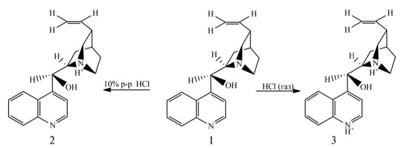 Для получения ионного стабилизатора 2 проведено протонирование раствором HCl азотного атома хинуклидинового бициклического фрагмента. При обработке раствора (8S,9R)-(-)-цинхонидина, (-)-Cin, 1, газообразным HCl образуется стабилизатор 3, протонированный по двум атомам азота: в хинуклидиновом бициклическом фрагменте и в хинолиновом кольце (см. схему 1).