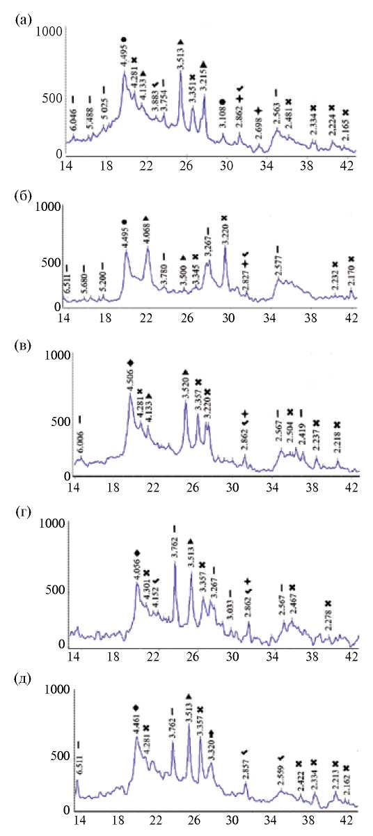 Рис. 1. Рентгеновские порошковые дифрактограммы: а) нативной (НГ), б) ОГ250, в) ОГ350, г) ОГ500, д) ОГ600. ▲ – калиевые полевые шпаты, ● – пирофиллит, ♦ – палыгорскит, I – монтмориллонит, ✖ – кварц, ✓– каолинит, 🟆 – арагонит, ⇧ – галлуазит.