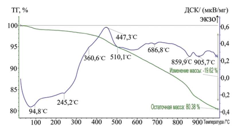 На рис. 2. показаны результаты ТГ и ДСК для отработанной отбельной глины. Термогравиметрический анализ (ТГ) – метод термического анализа, при котором регистрируется изменение массы образца в зависимости от температуры. Видно, что при повышении температуры до 999.5°С остаточная масса составляет 80.38%, то есть образец ОГ потерял 19.62% своей массы при нагревании.