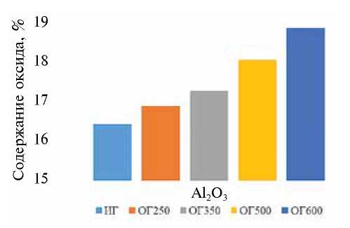 Изменения количества оксидов при нагревании отхода отбельной глины представлены на рис. 3. Как видно из рис. 3, с повышением температуры увеличивается доля Al2O3 это, по-видимому, связано с удалением свободной и конституционной воды.