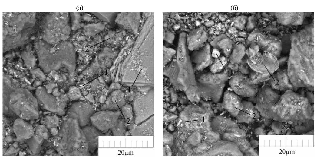 На рис. 4. видно, что частицы ОГ обладают выраженной развитостью микрорельефа. Также при анализе микрофотографий установлено, что в основном поверхность анализируемых образцов представлена равномерно распределенной глинистой фракцией (1 на рис. 4). Изометричная форма частиц с хорошо заметной слоистой структурой позволяет идентифицировать основной глинистый минерал как монтмориллонит (2 на рис. 4).