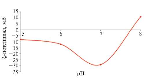 - Анализ ξ-потенциала показал, что максимальное значение ζ-потенциала (–29.2 мВ) наблюдается при рН 6.5–7.5, а изоэлектрическая точка при pH = = 7.8.