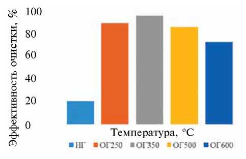 График зависимости эффективности очистки растворов МГ от температуры обжига ОГ доказал, что наибольшая эффективность очистки достигается при обжиге ОГ при температуре 350°С (рис. 7).