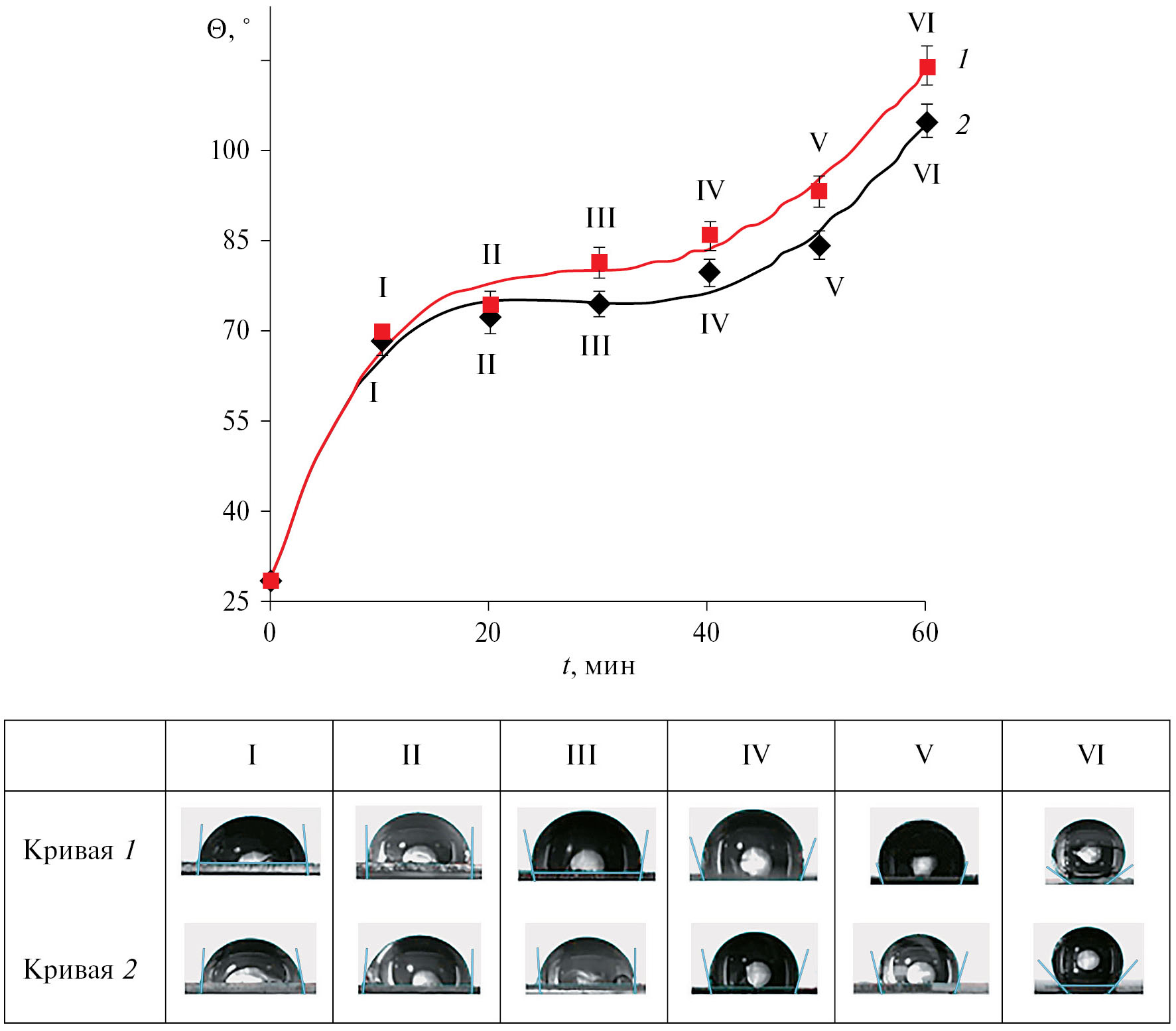 Таблица 4. Значения краевых углов материалов, перенесенных на стеклянную подложку, через 60 минут от начала опыта*