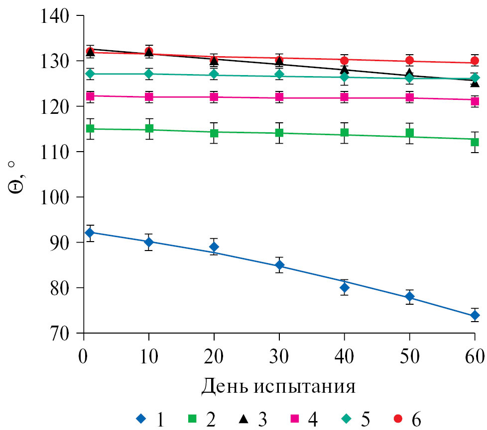 Частичная или полная потеря гидрофобных свойств является основной проблемой при разработке водоотталкивающих покрытий. Разрушение топографических элементов поверхности, появление дефектов под влиянием термического или химического воздействия [17] являются причинами снижения гидрофобных свойств. Например, авторы работы [18] получили супергидрофобные покрытия на основе полидиметилсилоксана со значением краевого угла 161°, но не обладающие достаточной когезионной прочностью, вследствие наличия множественных трещин и пор. Каждый цикл заморозки-разморозки приводит к удалению гидрофобизирующей добавки или разрушению покрытия, и, как следствие, снижению гидрофобных свойств [19]. Поиск способов сохранности гидрофобности покрытия также находится во внимании исследователей.