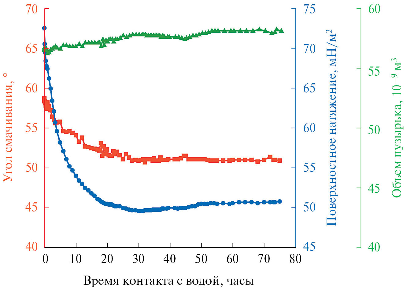 Рис. 2. Эволюция угла смачивания (красные квадратики, правая ось), поверхностного натяжения (синие кружки, первая левая ось) и объема пузырька (зеленые треугольники, вторая левая ось) от времени непрерывного контакта поверхности с поджатым пузырьком под водой