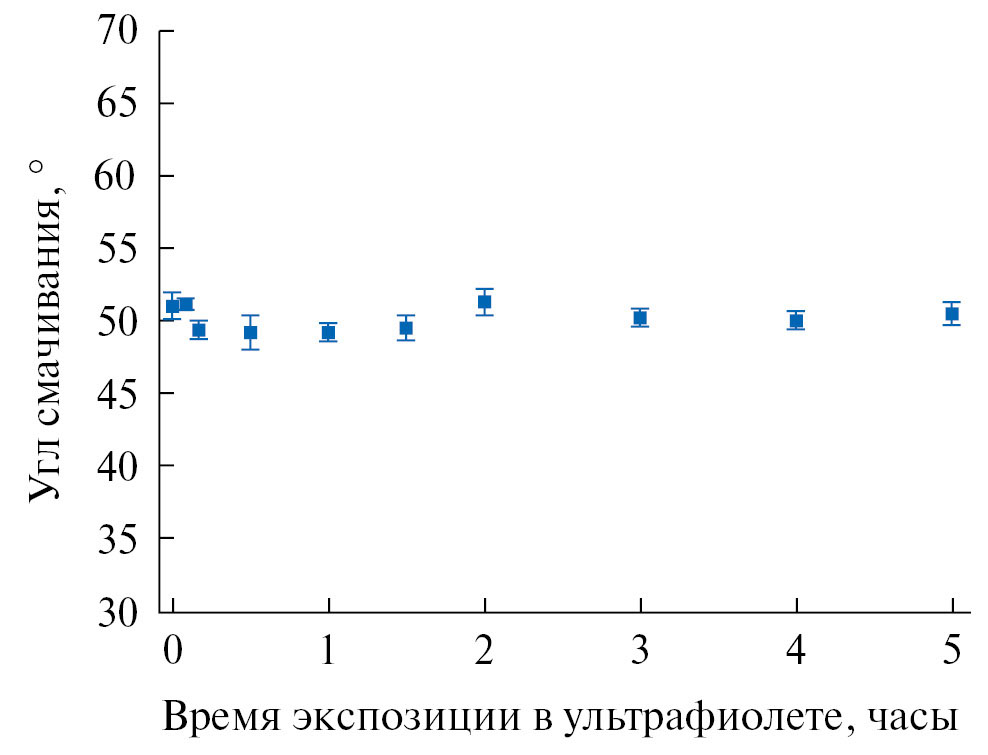 Практически постоянное значение углов смачивания в течение всего эксперимента при больших использованных мощностях излучения и длительных временах облучения указывает на высокую устойчивость полученного покрытия к разрушению под действием ультрафиолета.