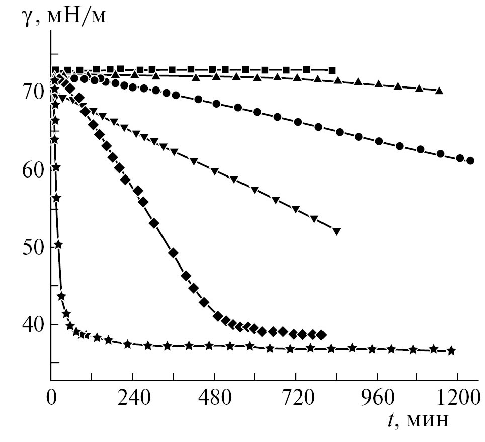 Рис. 2. Кинетические зависимости поверхностного натяжения диализованных растворов p3 с добавлением NaCl. Концентрации полиэлектролита: 0.030 масс. % (квадраты), 0.010 масс. % + 0.010 М NaCl (треугольники), 0.010% + 0.013 М NaCl (круги), 0.010 масс. % + 0.016 М NaCl (перевернутые треугольники), 0.010 масс. % + 0.020 М NaCl (ромбы), 0.010 масс. % + 0.030 М NaCl (звезды)