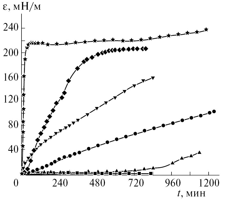 Действительная часть динамической поверхностной упругости для всех исследованных систем превышает мнимую часть примерно на один десятичный порядок, что указывает на чисто упругую пленку.