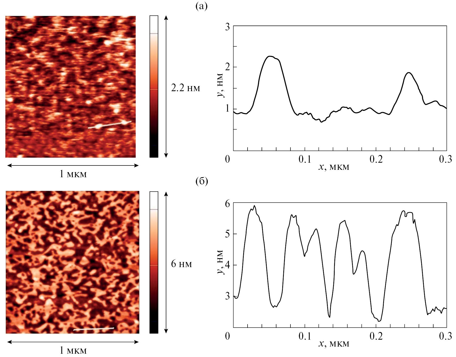 Рис. 4. АСМ-изображения адсорбционных пленок p3 при различных концентрациях NaCl 0 (а) и 0.05 М (б) и полиэлектролита 0.05 масс. % (а) и 0.01 масс. % (б)