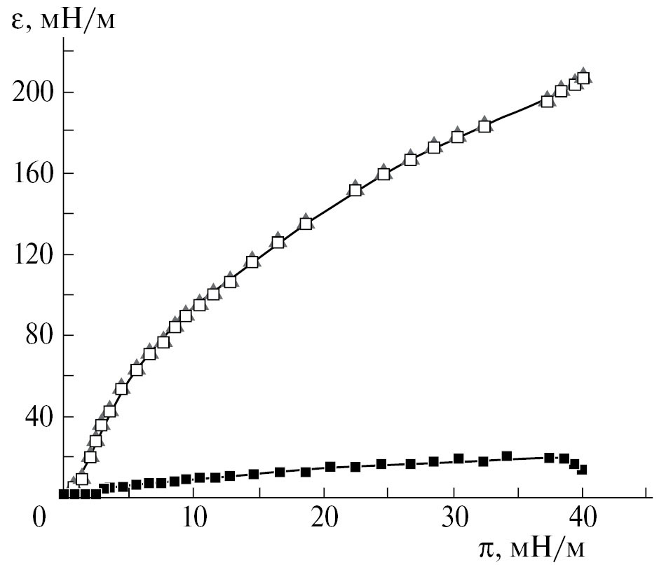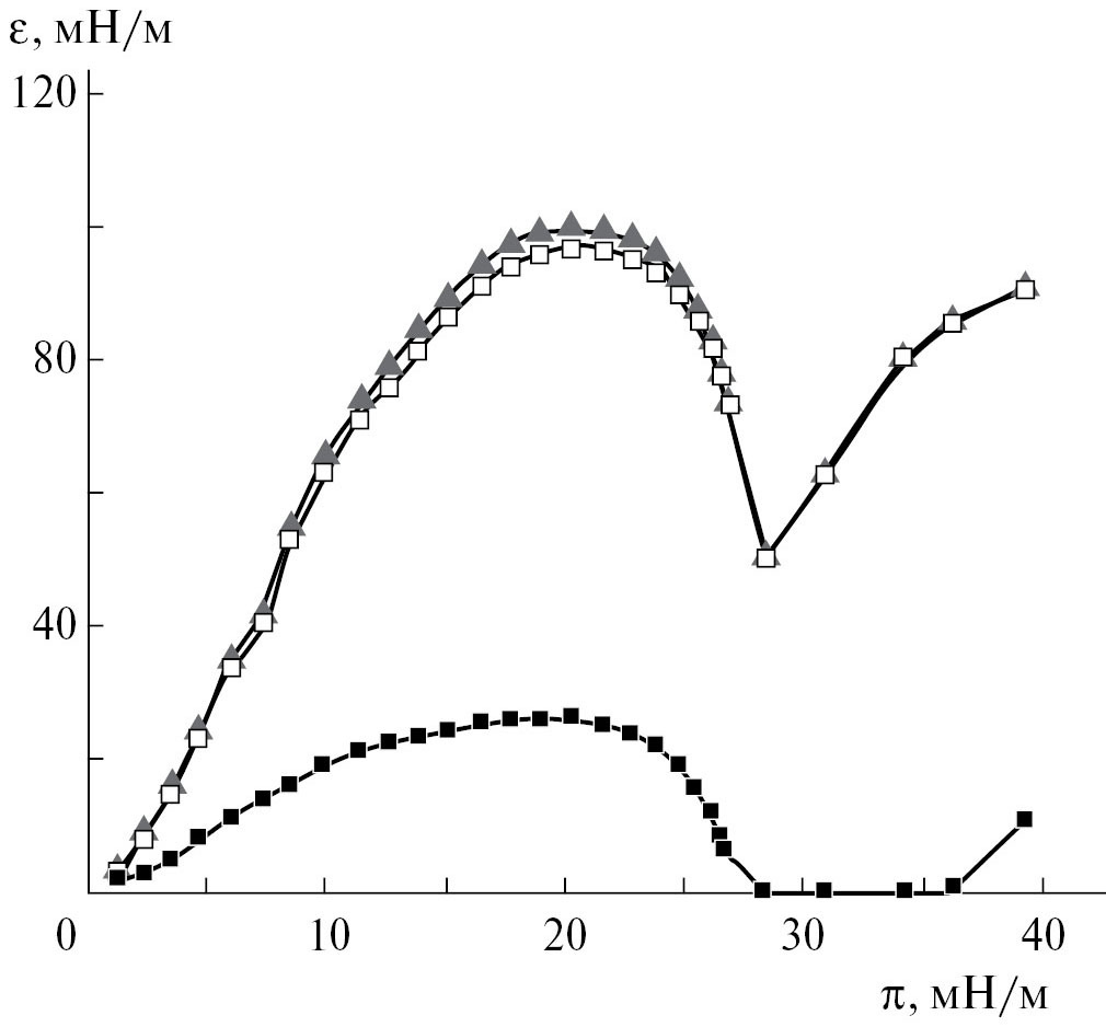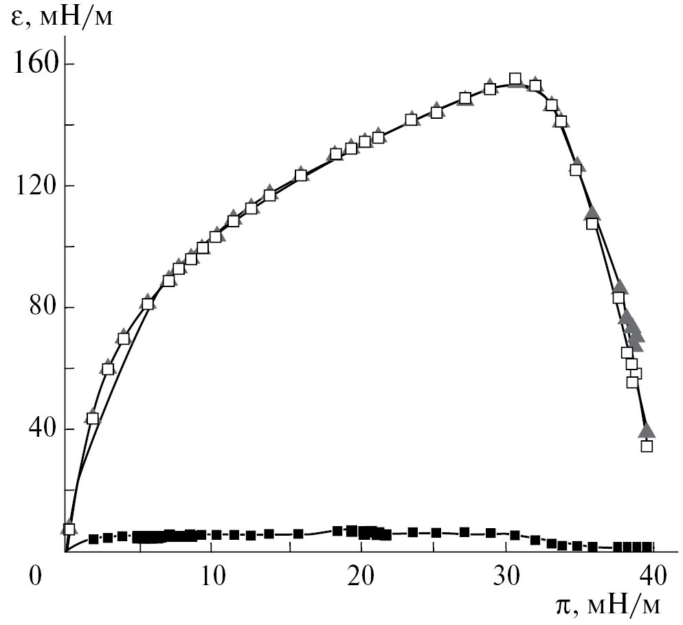 Рис. 5. Зависимость динамической поверхностной упругости (ε) от поверхностного давления (π) для нанесенного монослоя p1. Серые треугольники соответствуют модулю динамической поверхностной упругости, незаполненные квадраты соответствуют действительной части динамической поверхностной упругости, а черные квадраты соответствуют мнимой части динамической поверхностной упругости