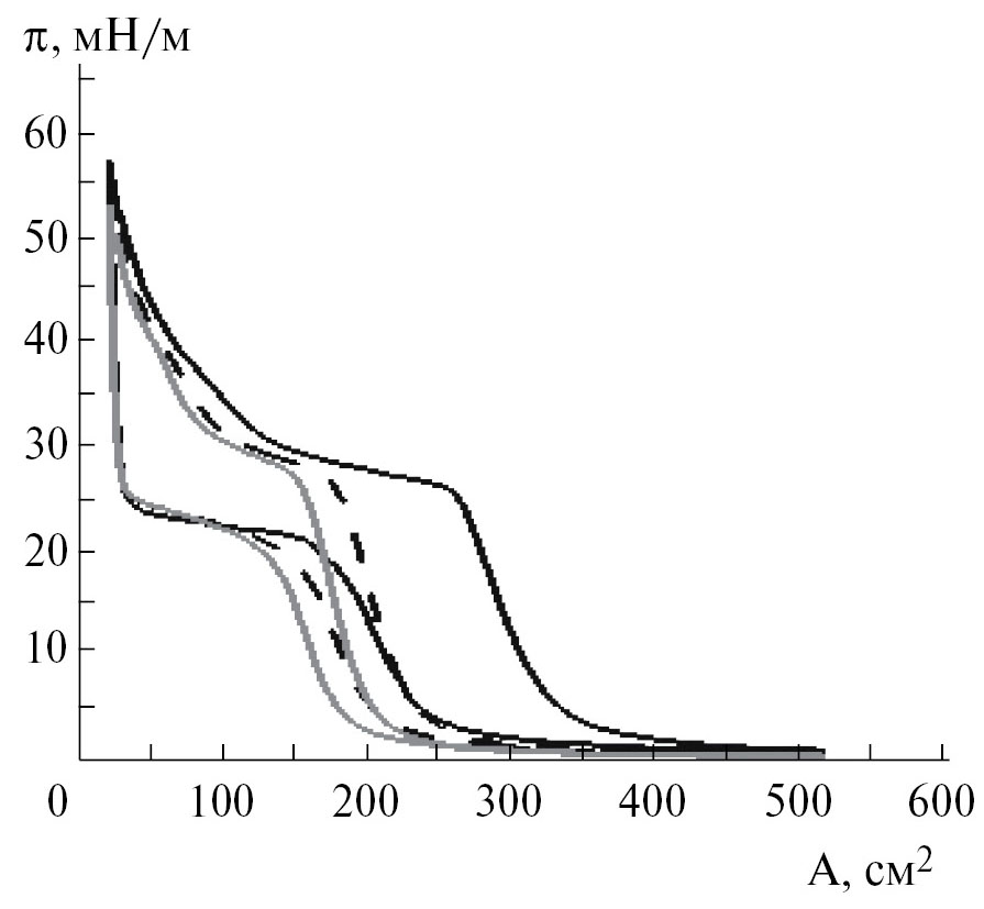Рис. 9. Изотермы сжатия/растяжения для нанесенного монослоя p4. Черная, пунктирная и серая линии соответствуют первому, второму и третьему циклам сжатия/растяжения, соответственно